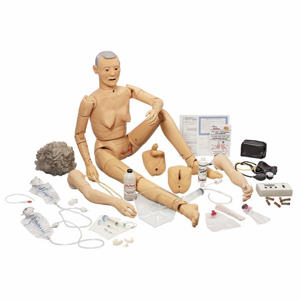 The Complete GERi is a geriatric patient care simulator with natural flexibility and superior range of motion. It has an overall female appearance but is also convertible to a male with removal of the wig and attachment of male genitals.