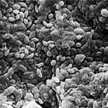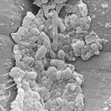 A multilayered biofilm consisting of healthy-looking cells surrounded and overlayed with amorphous-looking exopolysaccharides.